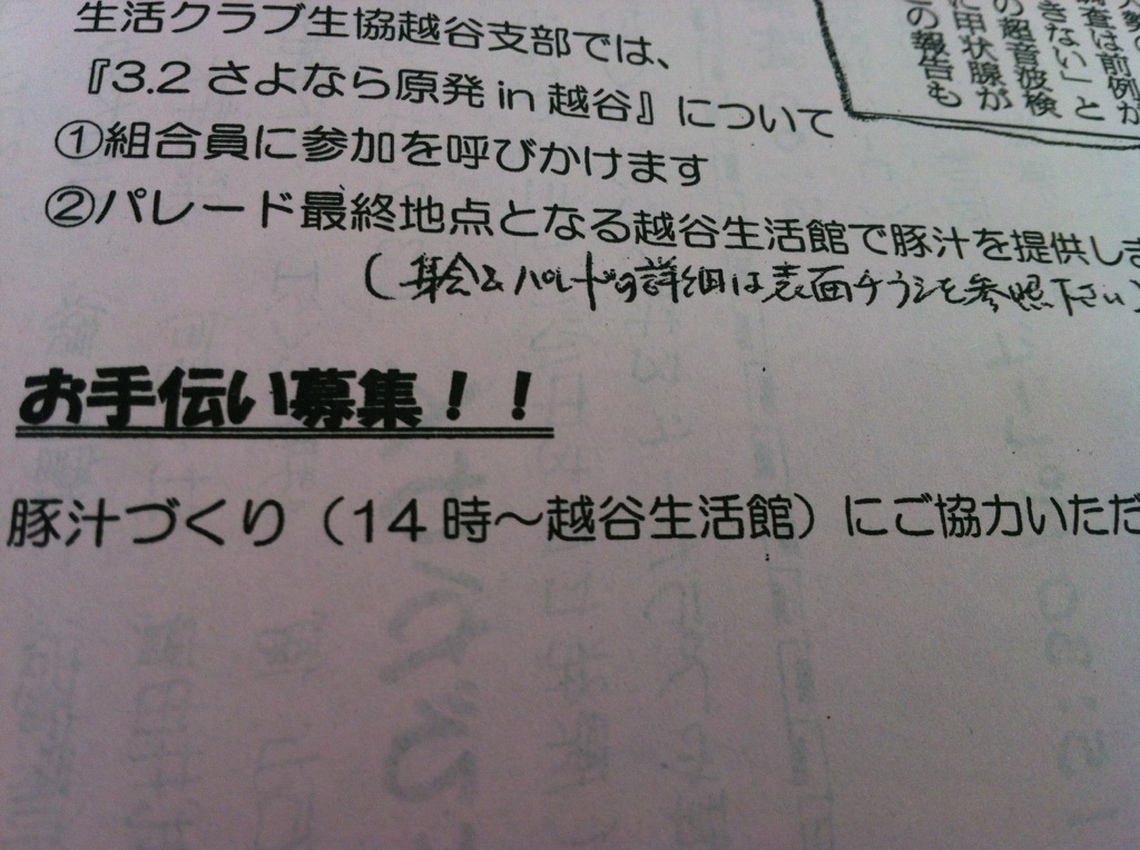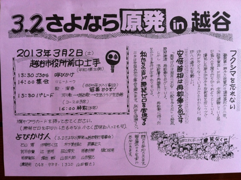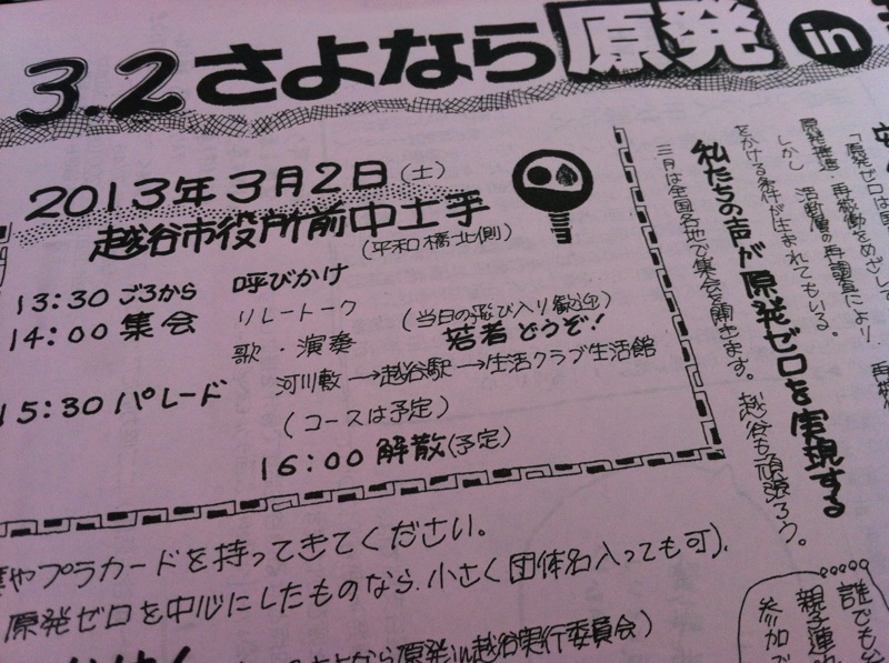 今週配布されてるチラシに、3.2さよなら原発in越谷があります。